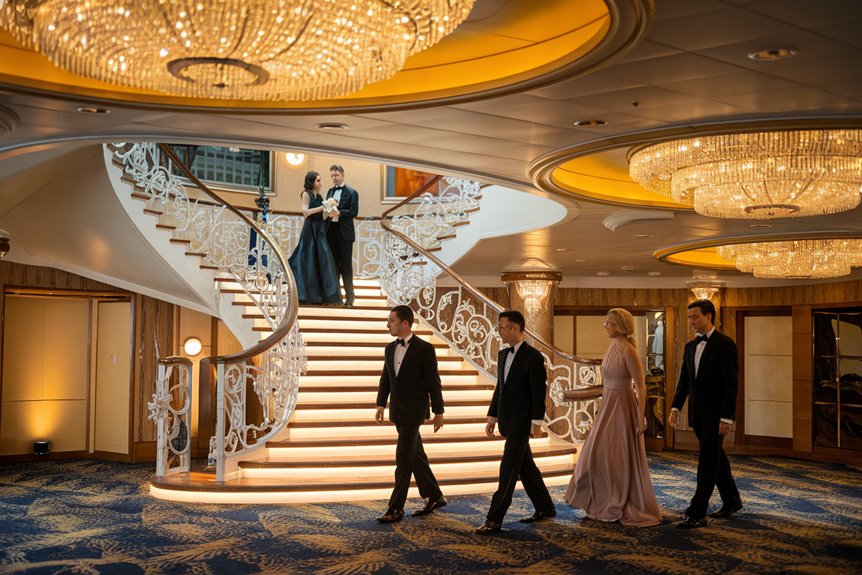 - Cunard’s formal evenings maintain the most traditional approach, requiring black-tie clothing in main dining rooms after 6 PM