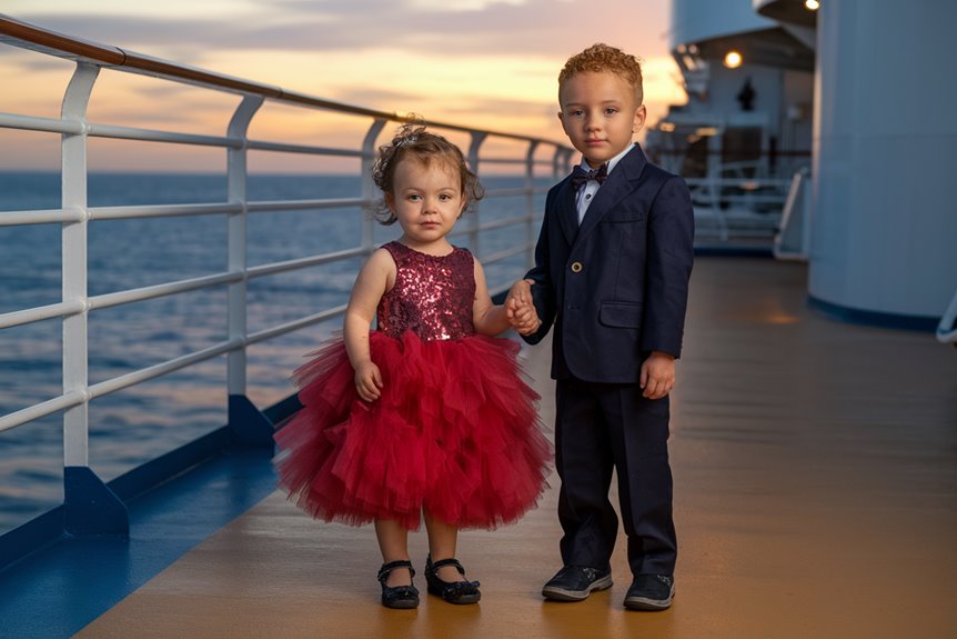 Smart cruise clothes for children can match their parents’ look while staying comfy and practical. For girls, a knee-length dress made from light cotton or chiffon works nicely with flat dress shoes or small-heeled mary janes. Go for darker shades or patterns that handle marks well. Pack a light cardigan for when the air conditioning is running.