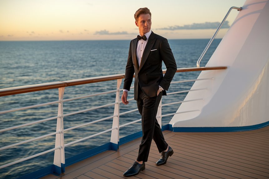 For upscale cruises with stricter dress codes, you might need a dinner jacket with appropriate items including a bow tie and smart black shoes. However, many modern cruises are becoming more relaxed about evening dress requirements. Although you still might like a tuxedo.
