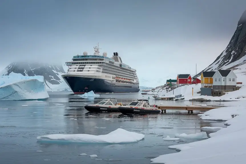 You’ll reach Ilulissat’s shore by Zodiac boat because cruise ships must anchor in deeper waters. The town’s famous icefjord, a UNESCO World Heritage site, stands as its main attraction. You’ll see massive icebergs break off from the world’s fastest-moving glacier into Disko Bay.