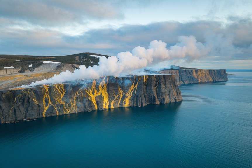 These remarkable cliffs burn continuously due to natural chemical reactions. You’ll see constant smoke plumes rising from the rocks and bright mineral-stained pools dotting the landscape. The site requires you to wear protective gear, including a gas mask, because of strong sulphur dioxide emissions.
