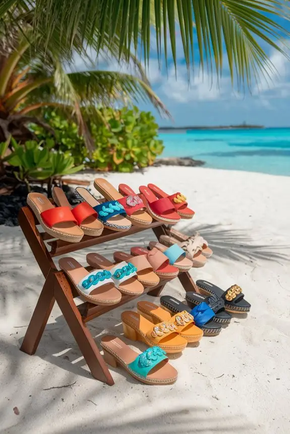 You’ll swap between different shoes as the day goes on. For daytime, bring comfy trainers or walking shoes for shore visits and sporty activities. Evening events need smart sandals or dress shoes, and pool time means waterproof slides or flip-flops. Go for breathable shoes that’ll keep your feet cool in the Caribbean heat.